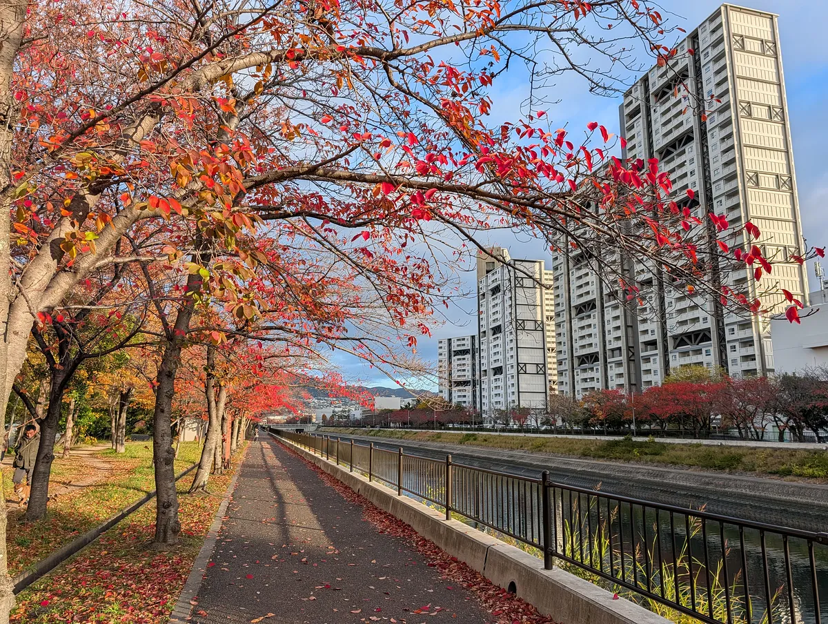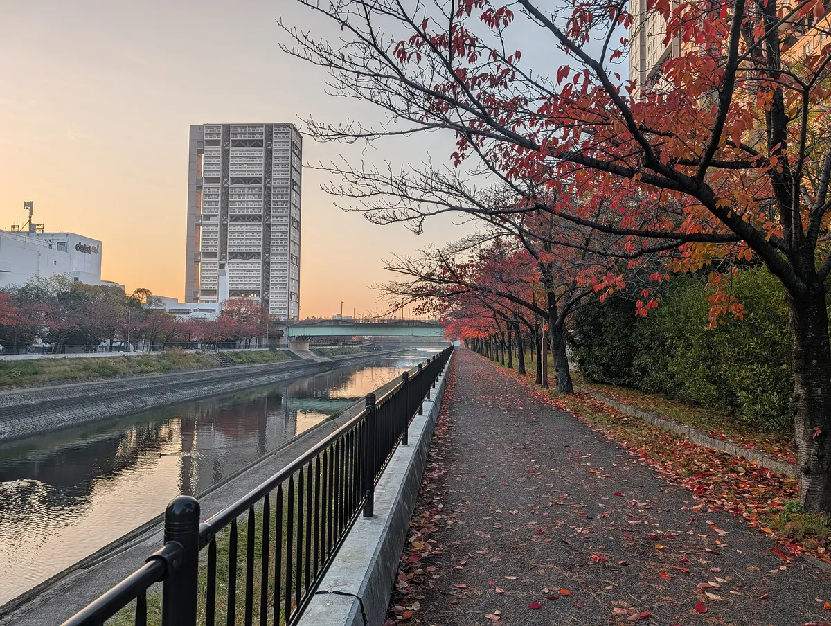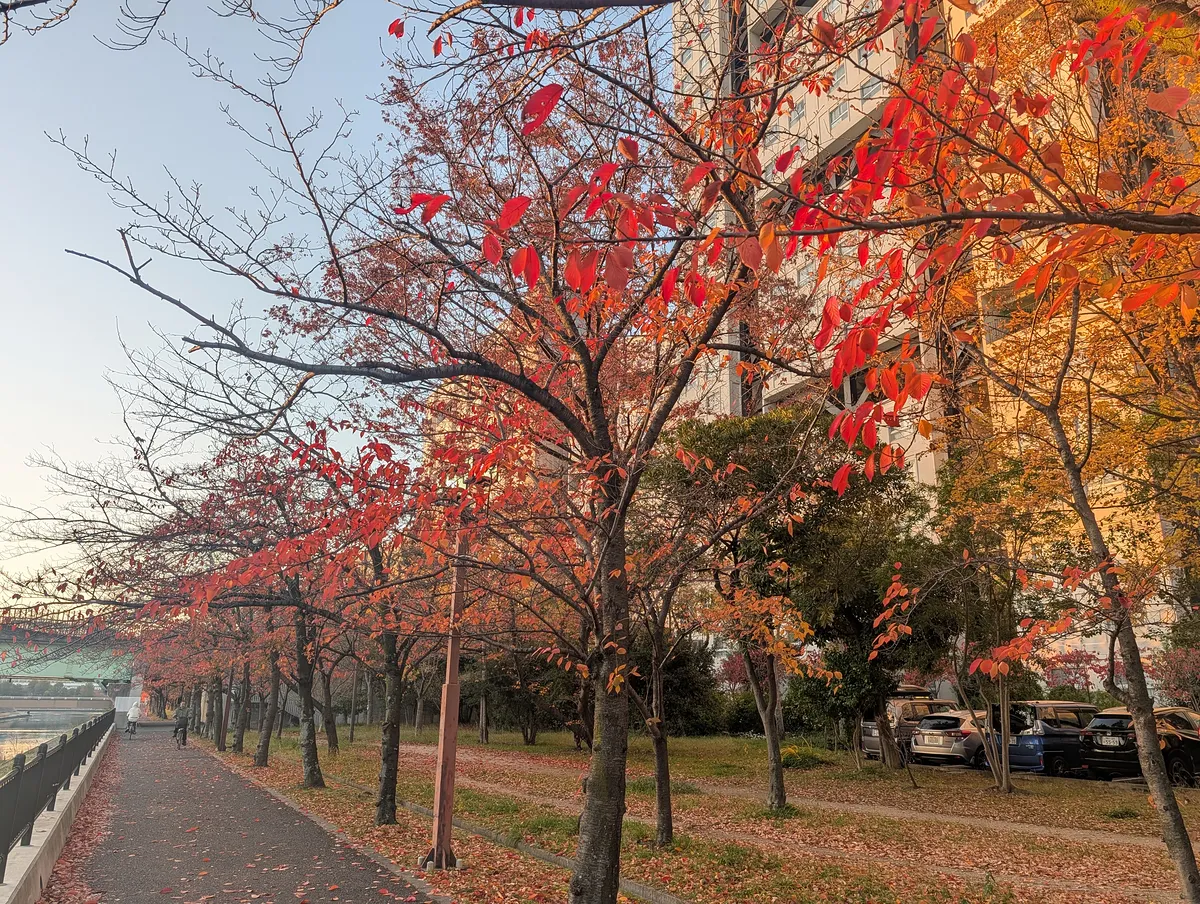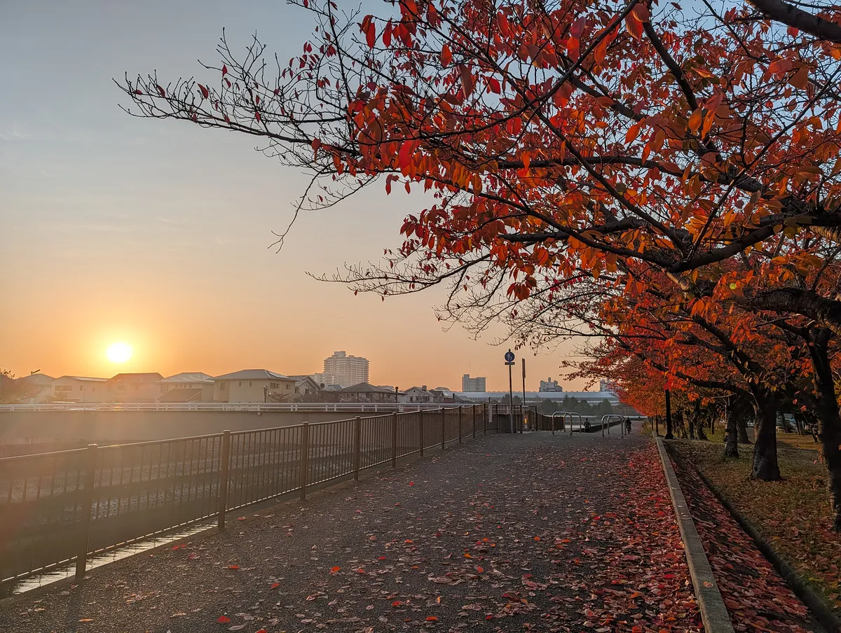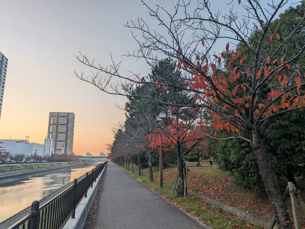 空模様、紅葉の赤、川面の反射、すべてが好みすぎる朝だった。