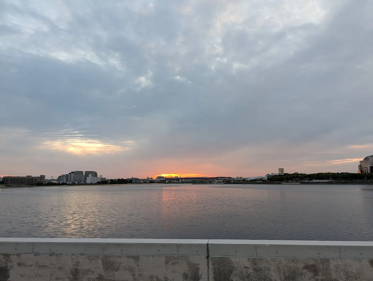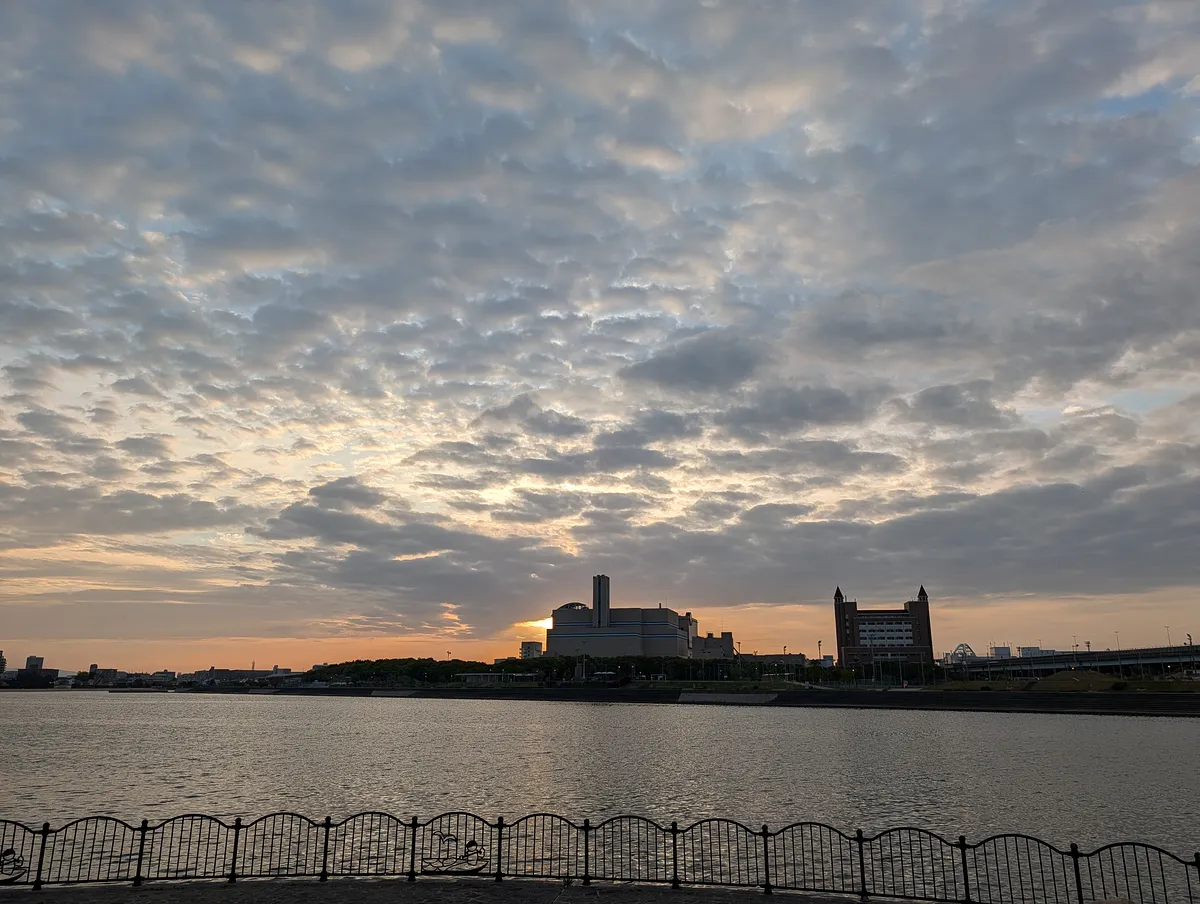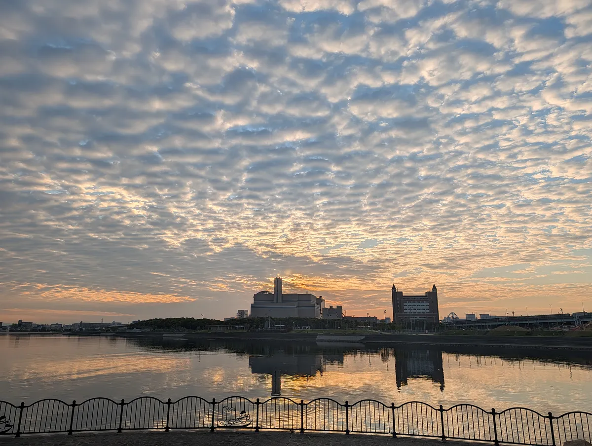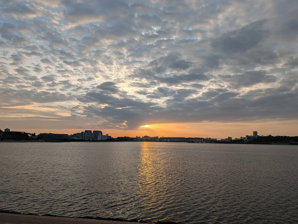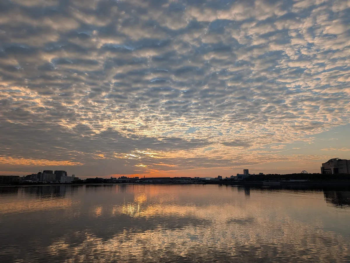 今朝は綺麗な巻積雲が出てて、それが水面に反射して素晴らしかった。